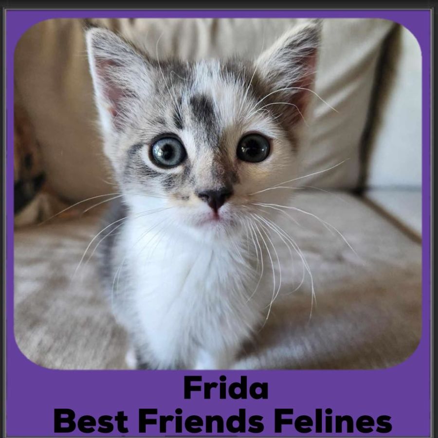 Frida is a striking little girl with the softest fur. She will meow for attention and weave through your legs. She adores a cuddle and play. Frida eats fast, plays hard and naps in between. She would make a great addition to any home.