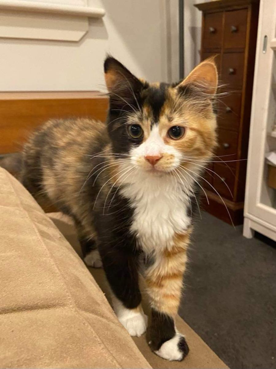 Ivy is a stunning cat. She is very playful with her siblings and once she warms to you she enjoys a pat and purrs happily. She is an independent kitten and is looking for a quieter patient home that will help her come out of her shell and into your heart. She is gentle and sweet and deserves a loving family.