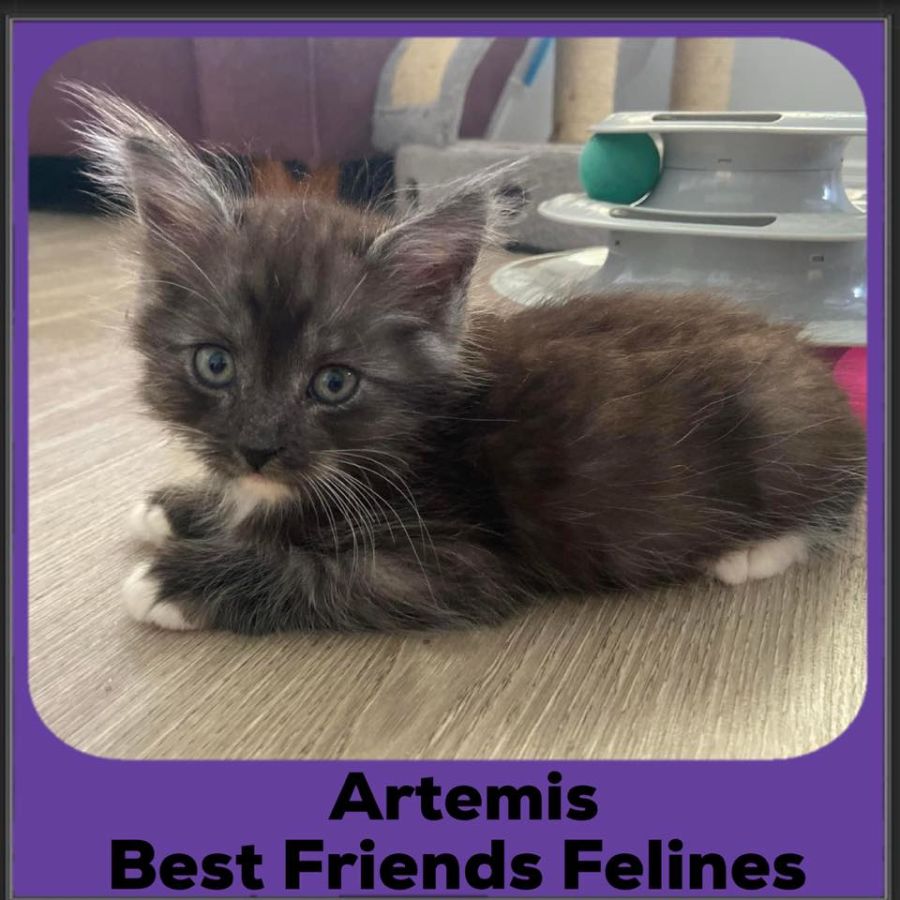 Artemis has a gorgeous coat with long soft fur and cute little white toes. He’s a big boy and we think he will grow up to be a beautiful big fluffy cat.