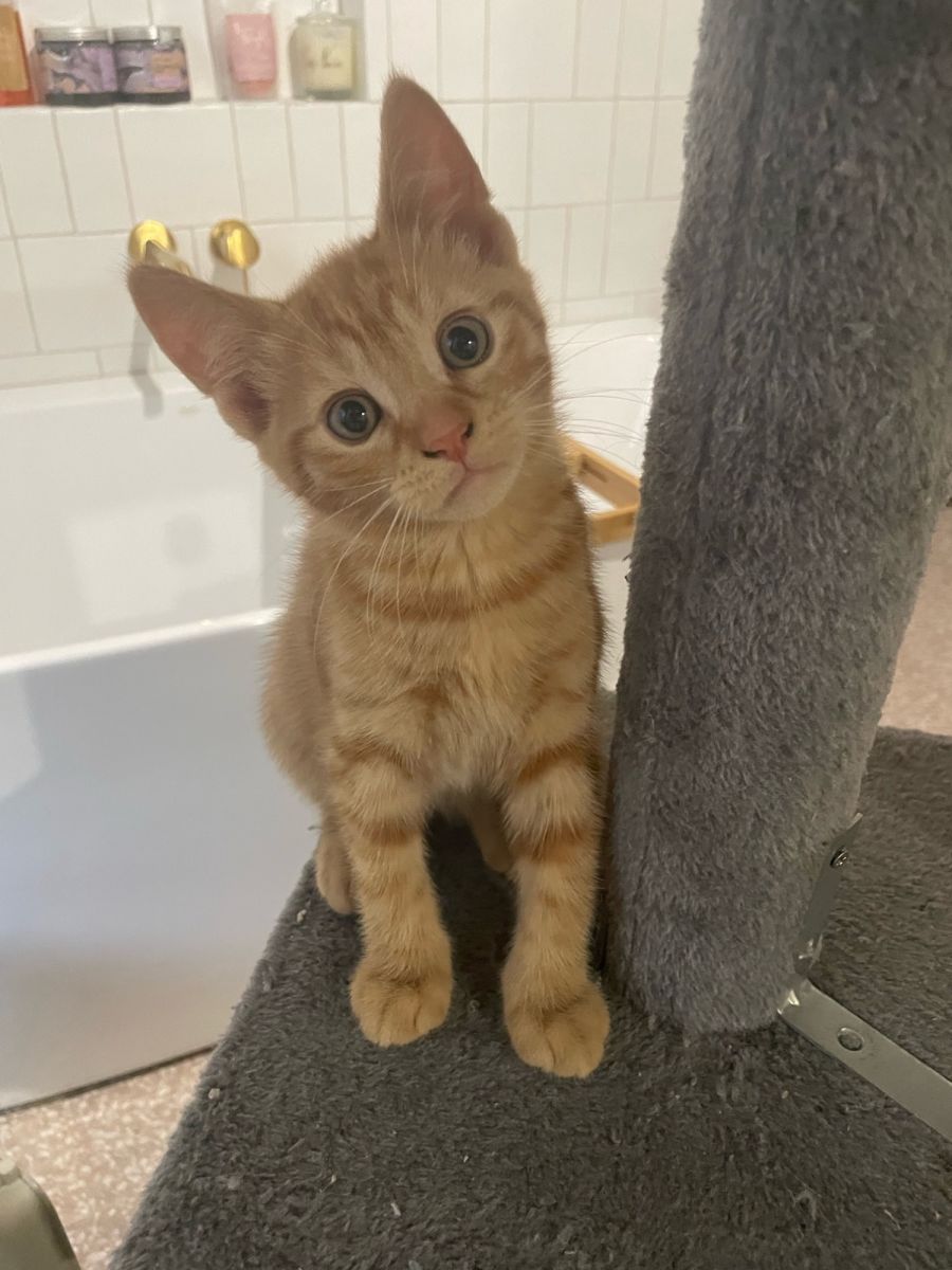 With his striking ginger tiger stripes, Ziggy is easily distinguishable from his ginger siblings. The most outgoing and smoochiest of his brothers, Ziggy is very playful, enjoys climbing all over the cat tower and loves to spar and play with his sister Daisy.