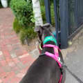 Juni has fit in perfectly in her foster home with a similar aged male greyhound. They enjoy their walks and play time together but are just as happy doing their own thing. Juniper has enjoyed welcoming visiting dogs into her home and been very good meeting all dogs on her walks.