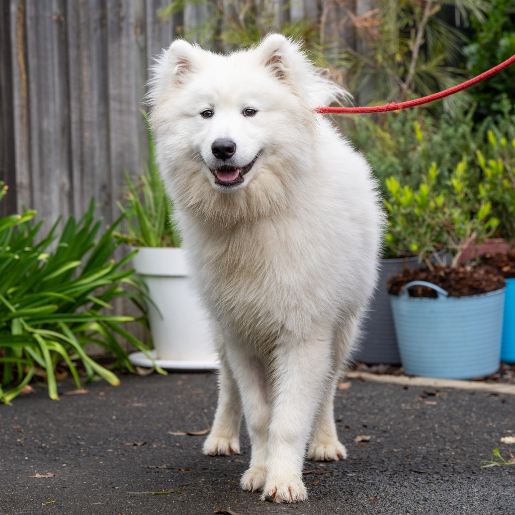 With his luxurious white coat, Monkey is a Samoyed that requires regular grooming to keep his fur in pristine condition. At 8 months old, Monkey is in the prime of his learning phase. Ongoing training is a must to channel his energy and intelligence into positive behaviors.