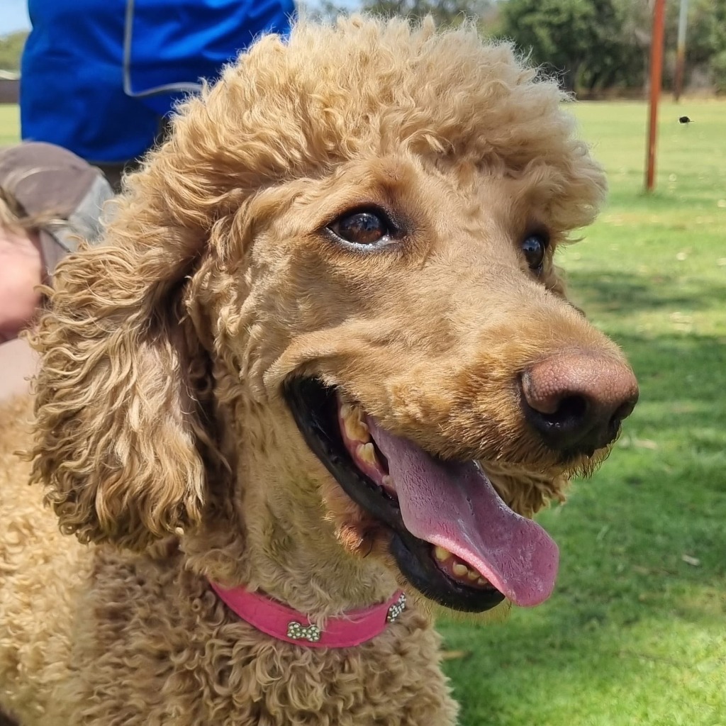 Poppy is a Standard Poodle but she's on the smaller side of this usually large breed. She's a very loving, friendly dog who thrives on being a big part of her owner's life. She will form a strong bond with her owner and want that person to be around most of the time, so won't suit full time workers. Poppy would be a great addition for active retirees or a stay at home worker. Her carers have grandchildren visit regularly and she enjoys playing with them. She's also good with other dogs.