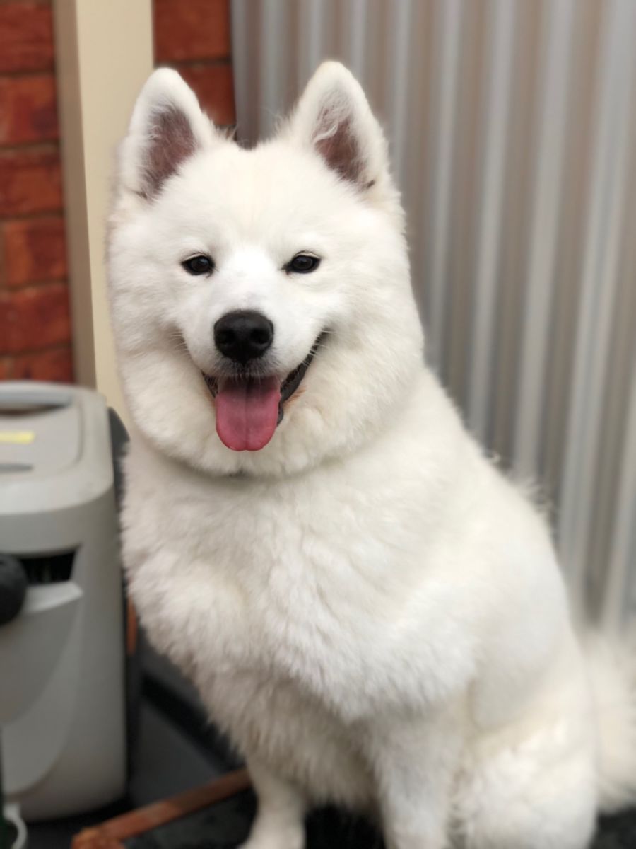 Due to Ellie is Samoyed with a thick double coat, she will need regular brushings and professional grooming every 6-8 weeks is highly recommended.