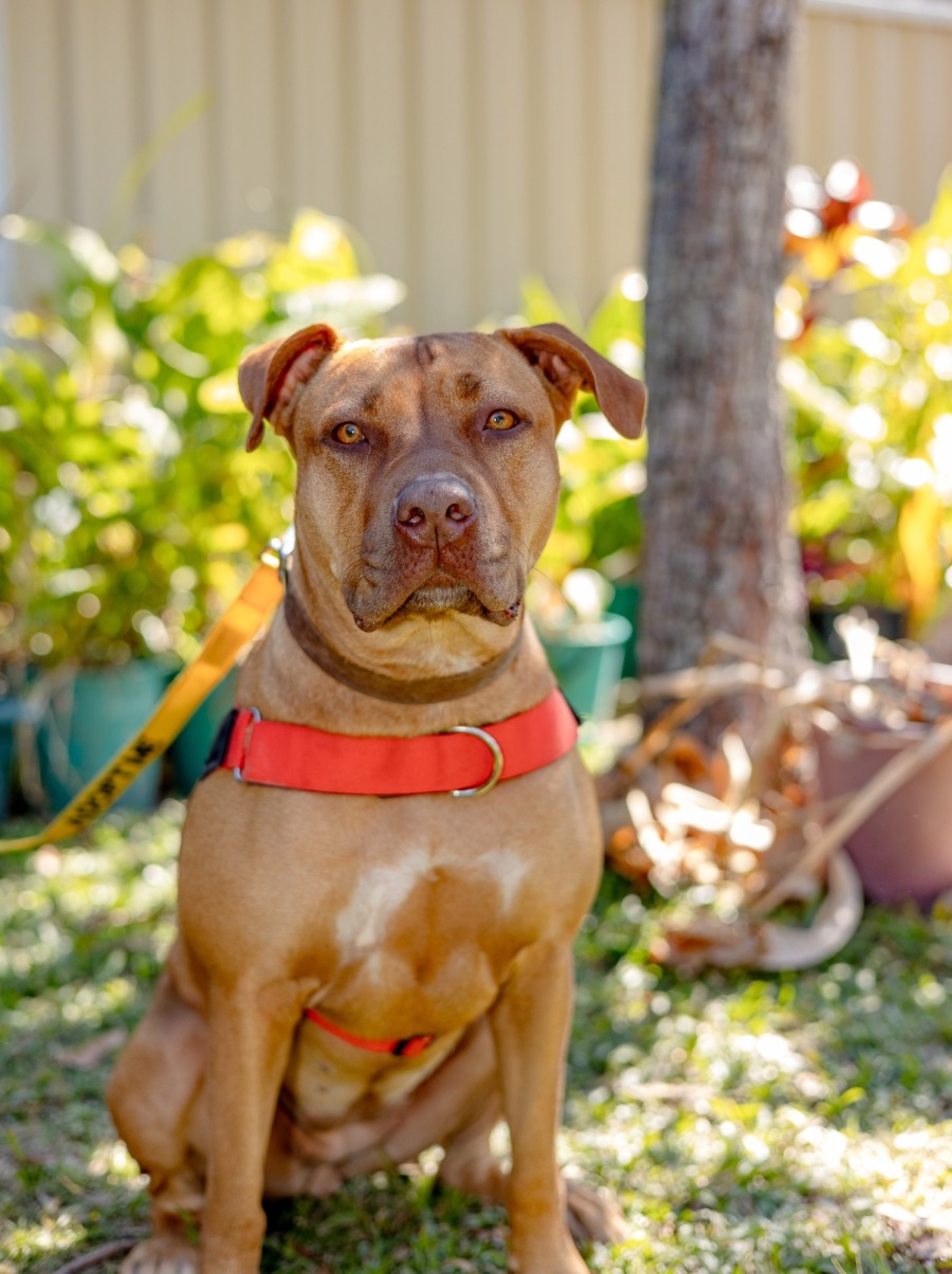 Hello, my name is Luna, and let’s say I am a cheeky and sneaky Staffy cross. I do actually know how to behave, but at times when I want your attention and you are not giving it to me, I might talk loudly (aka bark) at you. I do know my basic commands and am good at following them especially if you are offering me treats. I travel well in the car and love going for walks. I even walk well on lead. I sit quietly at the local coffee shop. I am usually great at meeting other dogs, however, if we get to play my Foster Mum says I play a bit rough, so my play mate has to be chosen very carefully if I were to have one but I love being an only dog and getting all the attention. I can also be a bit rough with small humans so would love a home with no small kids. Mum is pretty chilled at home and that keeps me chilled. I sleep outside, but do get up to loudly chase the occasional possum or cat. All my humans go off to work during the day, so you will usually find me hanging out under the mango tree, but as soon as you come home, I will be at the door waiting for a cuddle with my cheeky grin.