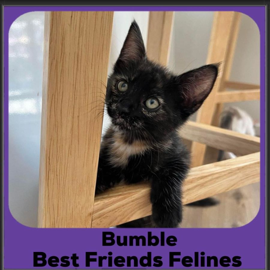 Bumble is a sweet and gentle kitten with a calm and laid-back demeanour. She enjoys spending her days lounging in sunny spots and observing her surroundings. Bumble is not as energetic as some kittens, but she still has moments of playfulness and enjoys chasing after toys and batting at feather wands. She is content to entertain herself with interactive toys, but also appreciates human interaction and affection. Bumble would thrive in a calm and peaceful home environment. She would do well with individuals or families who appreciate a quieter kitten and she would love the company of another cat or kitten. Bumble would appreciate a cozy and comfortable space where she can relax and feel safe. If you are looking for a gentle and calm companion who will bring a sense of tranquillity to your home, Bumble is the perfect kitten for you! She will provide you with endless love and companionship, and her playful moments will bring joy and laughter to your life. To meet Bumble, please fill in the below form: http://www.bestfriendsfelines.com/forms/meetngreet-form/