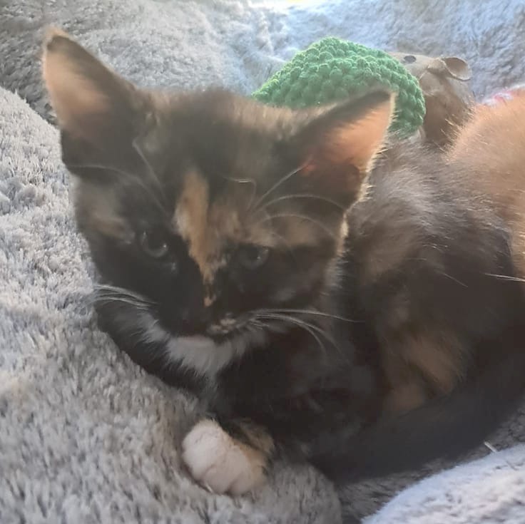 Cinnamon is a sweet, gentle kitten with a gorgeous tortie coat. She will steal your heart and loves cuddles. She was a bottle fed baby so is very used to being held close, and will lick or kiss you when content. Cinnamon has been well handled by children in her foster home so is child friendly.