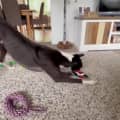 His foster family has two indoor guinea pigs and a kitty. Razor has shown very little interest in the piggies but he is very stimulated by the cat - he has always been muzzled when they have been in the same space and if he becomes fixated and unable to settle, then he's been leashed too. So it's best that he lives in a cat free home.