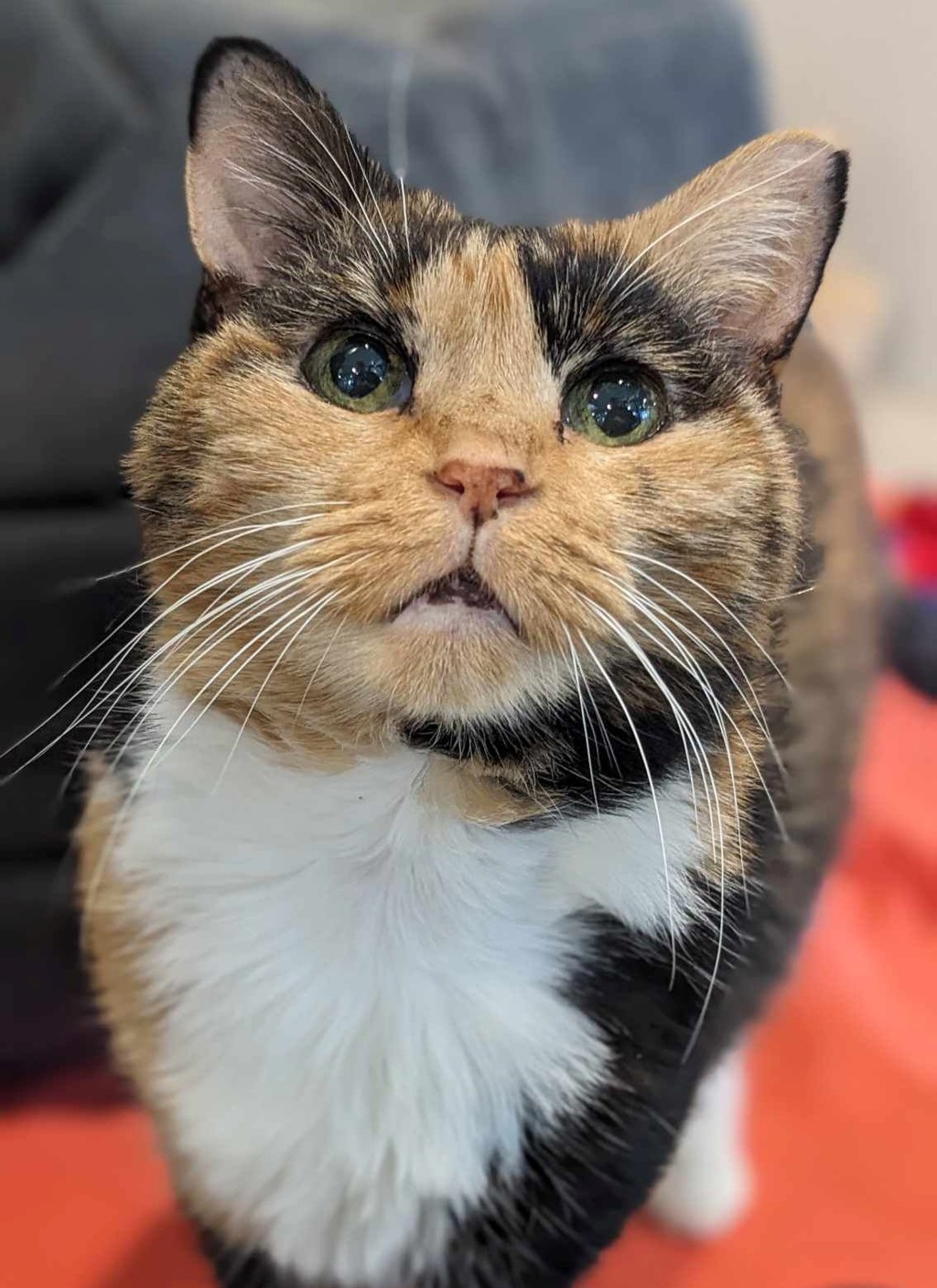 Turtle is a stunning tortoiseshell cat with bright, expressive eyes.