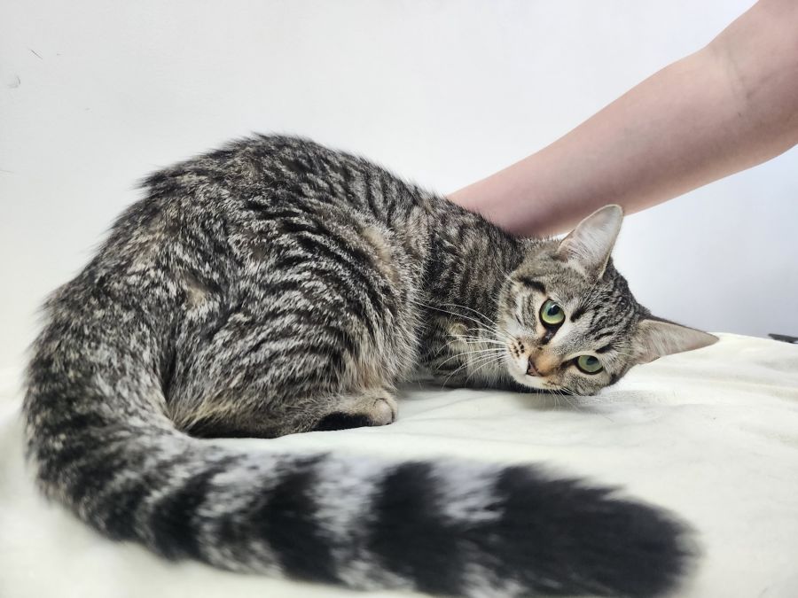 Only a baby herself under 1 year. Carol was abandoned outside a vet clinic with her then four then 2 week old kittens. She loves human attention doing little cutesy rolls , playing with toys and singing to your to get attention. She is incredibly soft and sweet and loves bum and ear rubs