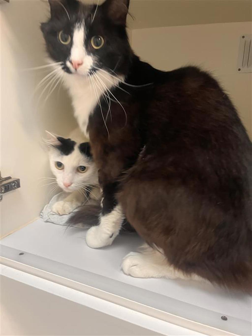 Dusty (black and white) is the confident explorer of the pair. He's curious, playful, and always keen to investigate what's going on around him. Whether he's chasing toys or making new feline friends, Dusty brings a relaxed, easygoing energy wherever he goes. He's the kind of cat who turns a house into a home with his warm and friendly nature.