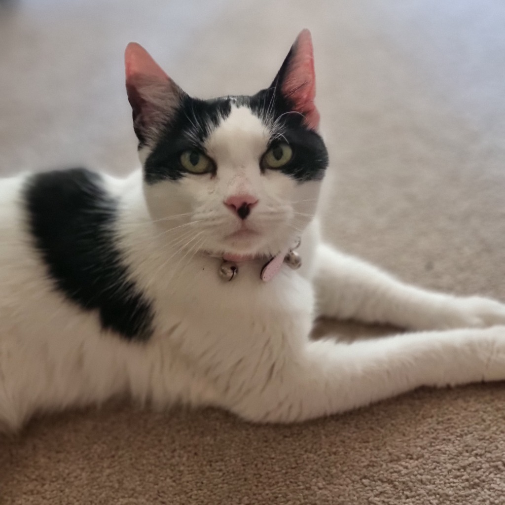Daisy doesn’t ask to go outside and seems pretty happy being indoors – she has a white nose and white ears so is probably best indoors only or in a shady outdoor enclosure for fresh air if you have one.