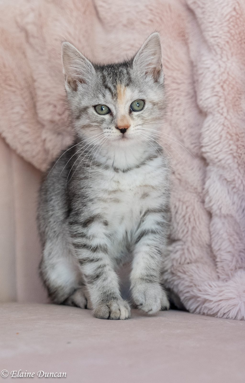 This charming girl is a delightful mix of sweetness, confidence, and lots of fun. To complement her gorgeous grey tabby coat, she has the cutest little light orange blaze on her nose, earning her the name Peaches.