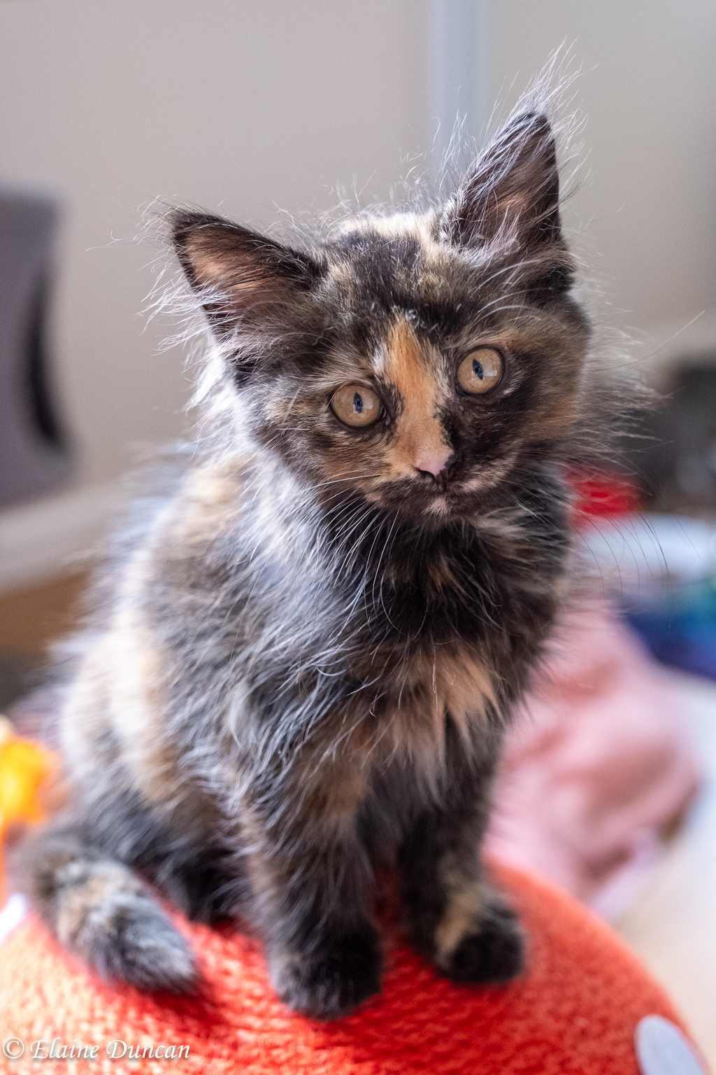 Little Maple's favourite thing is just hanging with her humans. She snoozes on their bed, preferably up against their face or head or in their arms. She loves to sit on their lap while they work from home or just stretch out nearby, and she even loves being carried around like a baby while happily making little air biscuits. She also does like a good play session with anything that wiggles and loves the cat grass in her foster home.