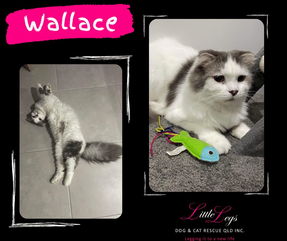 Introducing The Wildly Handsome Wallace! Wallace is not just your average cat, he’s special, in more ways than one! Wallace is a Scottish fold X, which has very uniquely shaped ears! His foster family thinks he’s super cute! He loves to flop around and is such a gentle boy. He is also very sweet when he meets new friends & cats. He is very chatty when it comes to his dinner time, he squeaks and makes sure his foster mum knows it’s time to eat! Wallace is fully litter-trained! This means no accidents in your home. He benefits from a hygiene shave (around his bum, every 6 weeks) and is calm enough to do him at home! We hope you can find it in your heart to consider this Fluffy baby being a part of your family fur ever!
