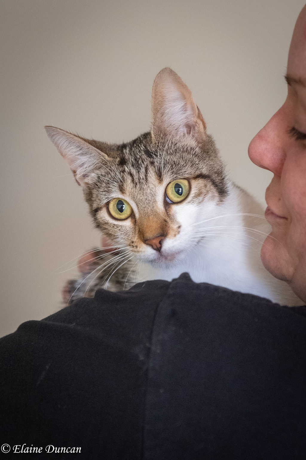 Despite being a year old, she still has a youthful and fun energy, and regularly gets the 'zoomies' joining her kittens in a wrestling match! She enjoys napping too, as all good cats do, and is good at finding nice cool spots to nap in the summer heat.