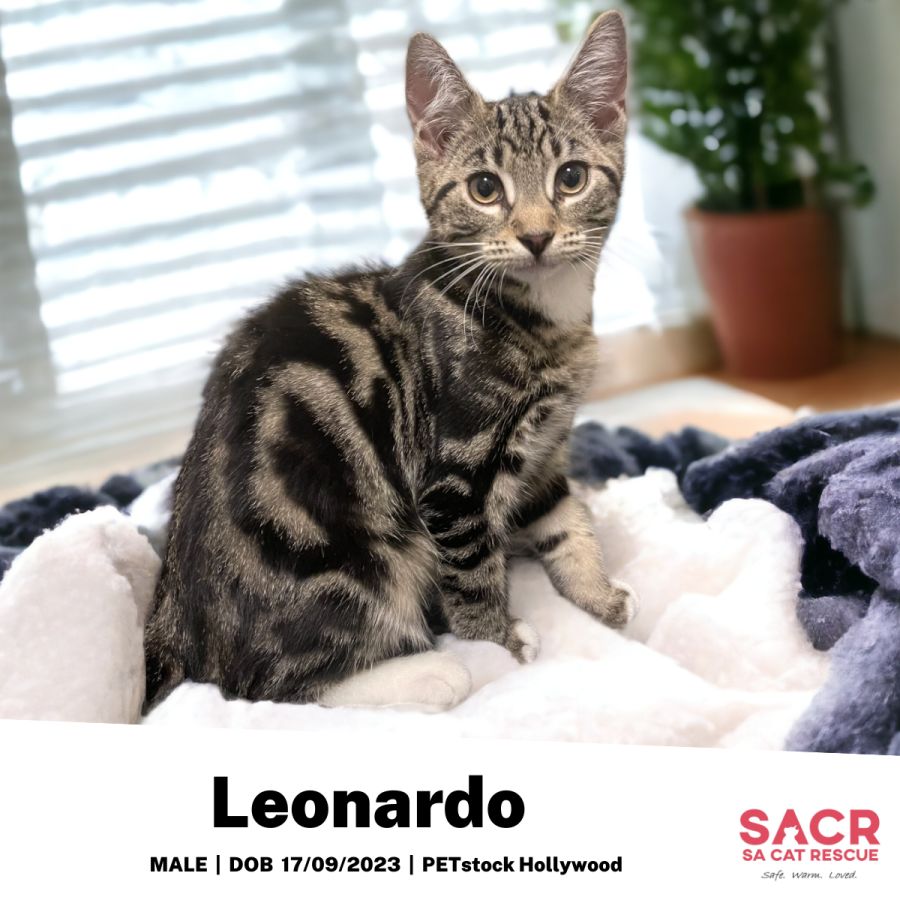 Leonardo’s adoption fee is $180 which includes desexing, microchipping, parasite prevention, and initial F3 vaccination.