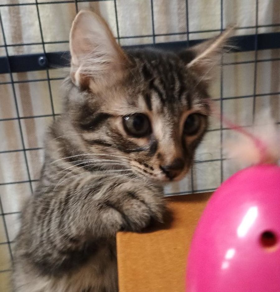 Chester has 5 brothers and 1 sister, all part of Elsa’s litter. He is a medium hair brown tabby kitten and likes to do all of the kitten things. He is playful and curious. This boy will fit into any family.