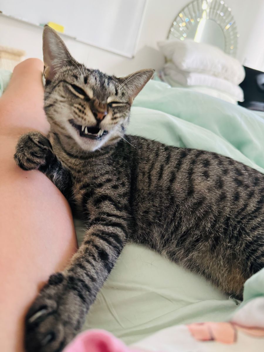 The trick is, she has bonded with me, and this has taken a couple of months to occur, but I have invested in her and she in me. Sadly, most people would not be willing to provide her with the time and patience she would need for her to trust you. She is now slowing coming around to my husband as well who she also lets him sleep in our bed đhaha! So, if you are not willing to invest time and love into her, then Tigerlily wouldnât choose you, it is best if you stop reading this ad for her. I sit and have coffee with her in the mornings, clean out her crate (this is her safe space that she likes to stay in sometimes) do my daily language lesson and just start my day with her, she loved that and eventually made my way to my bed!