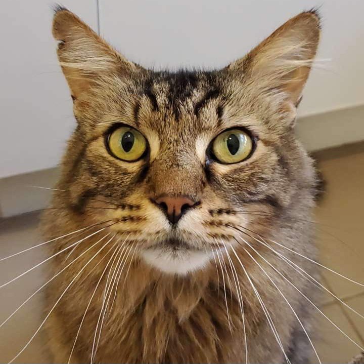 Meet beautiful big boy Jupiter. And when we say big, he is BIG! This super affectionate boy is part Maine Coon and is a large, fluffy boy typical of that breed. Jupiter loves having his luxurious coat brushed, and is a wonderful chatter box. Humans are his best friend and he enjoys kneading biscuits on his people!
