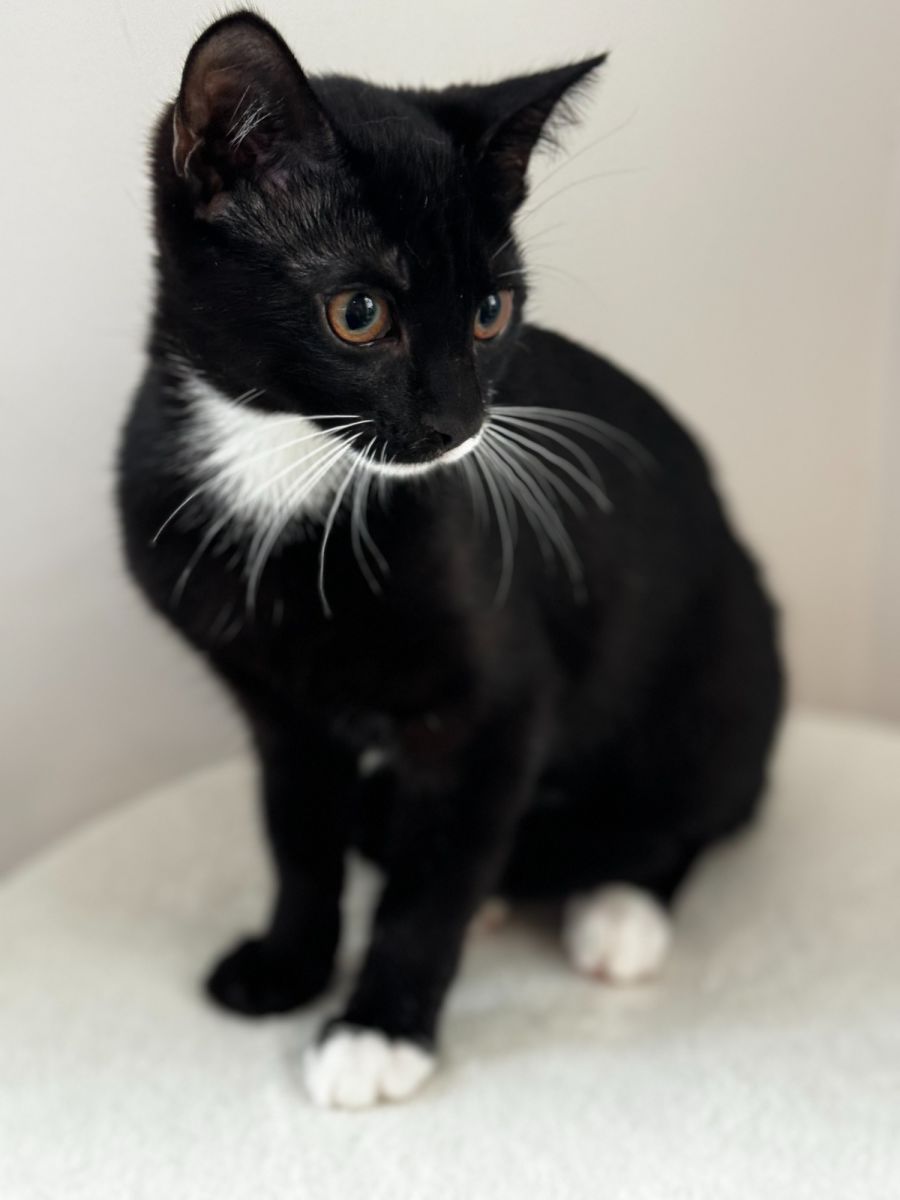 At 12 weeks old, she is all things kitten – playful, affectionate, cheeky! She adores playing with her foster siblings, and would like to be adopted by a family who has a resident cat/kitten to play with.