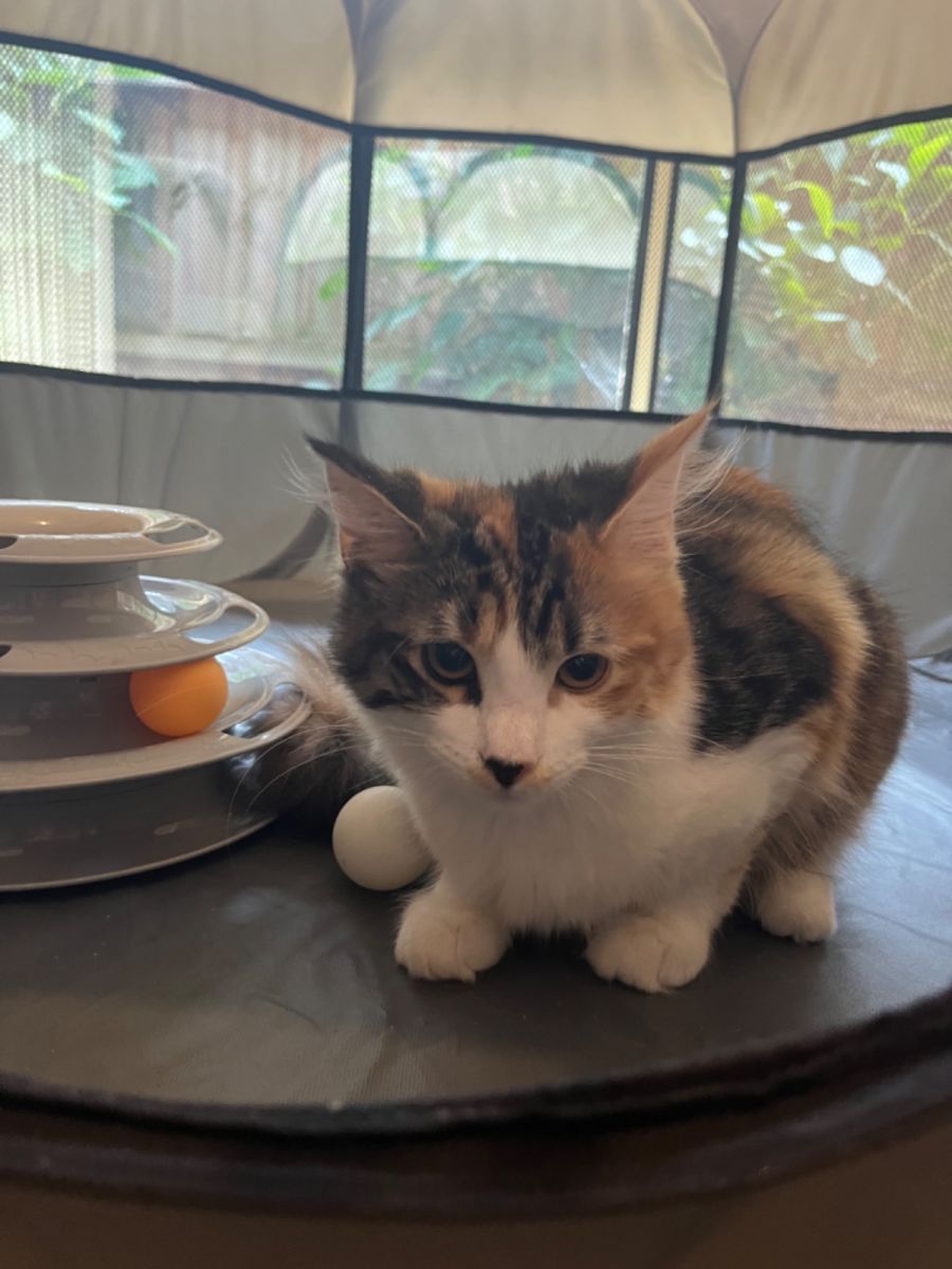 While Lulu shows her things are ok, Lizzie's shy but observant nature has its own charm. As she warms up to you, her affectionate side starts to shine. She enjoys curling up in a cosy corner and appreciates gentle strokes and cuddles, and in time, will show you her playful side.