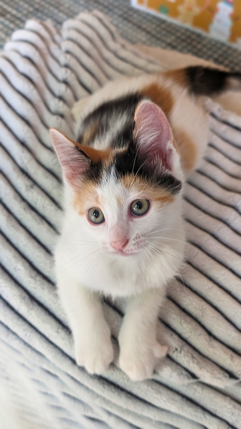 Sherry is a gorgeous calico with a lot of energy! Sherry has perfected the art of playing - she loves to play with anything and anyone; especially the other cats in her foster home, with whom she has bonded very quickly. She loves to wrestle with her sister, and when everyone else gets tired Sherry is always the last one standing, expertly pouncing on her sleeping siblings to wake them up for more fun! She is a very curious and confident young girl, who likes to explore and find new games to play.