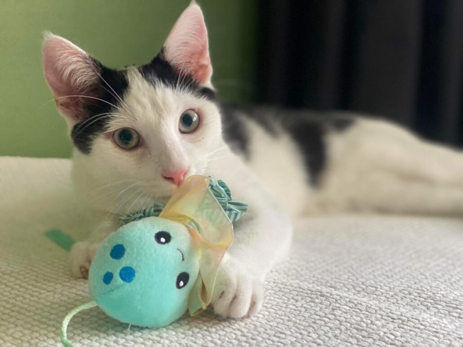 Sammy is a huge fan of catnip. He reacts very playfully to catnip sprayed onto his cat climbing poles. A very happy and gregarious boy. Sammy is a funny boy and will fill your world with fun and companionship.