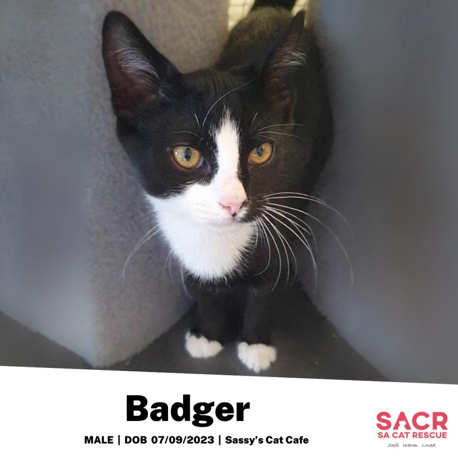Badger’s adoption fee is $180 which includes desexing, microchipping, parasite prevention, and initial F3 vaccination.