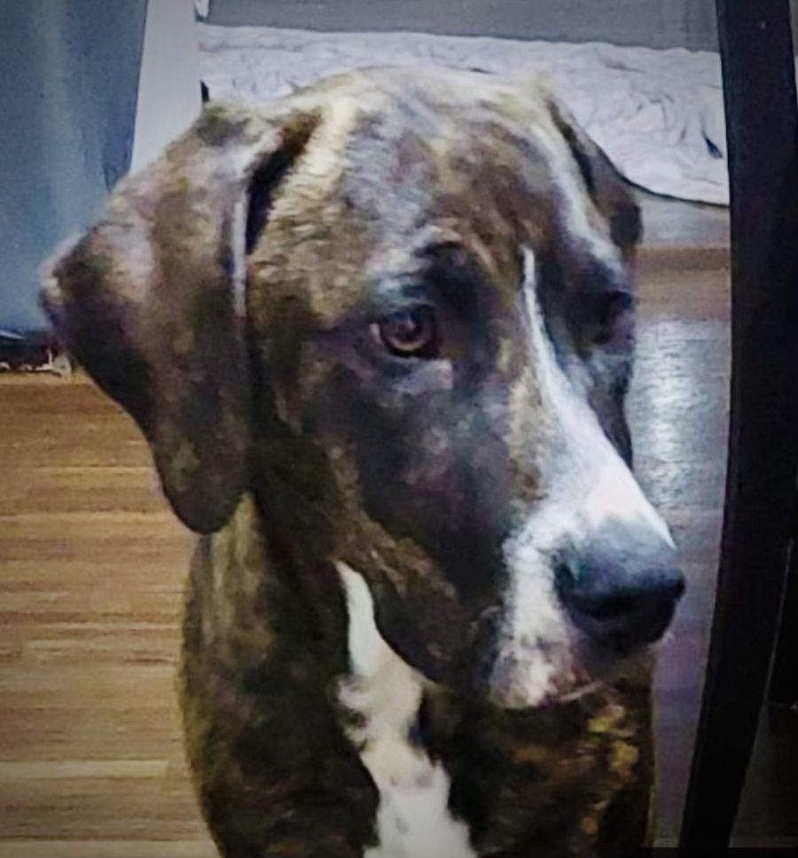 This gorgeous pup is Pearl, a Staffy x Mastiff x Rottweiler x Greyhound born 19 October 2023. She's part of a litter of seven who were abandoned at the pound and came to us for care.