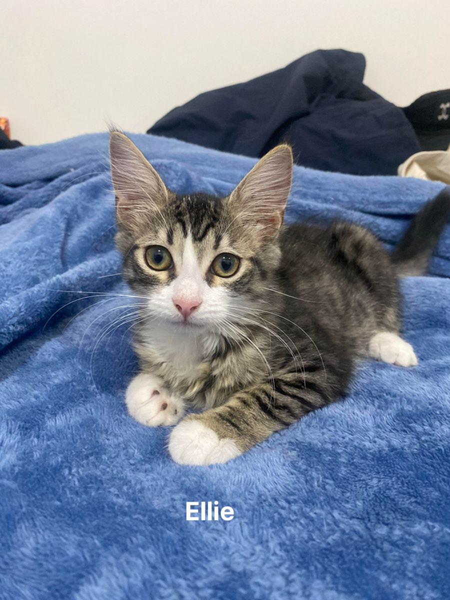 Ellie's a spunky little kitten. She's full of energy and loves spending her days exploring and turning anything she can find into a toy!. But don't let her playful side fool you – once Ellie bonds with her human, she transforms into a purring cuddle bug!