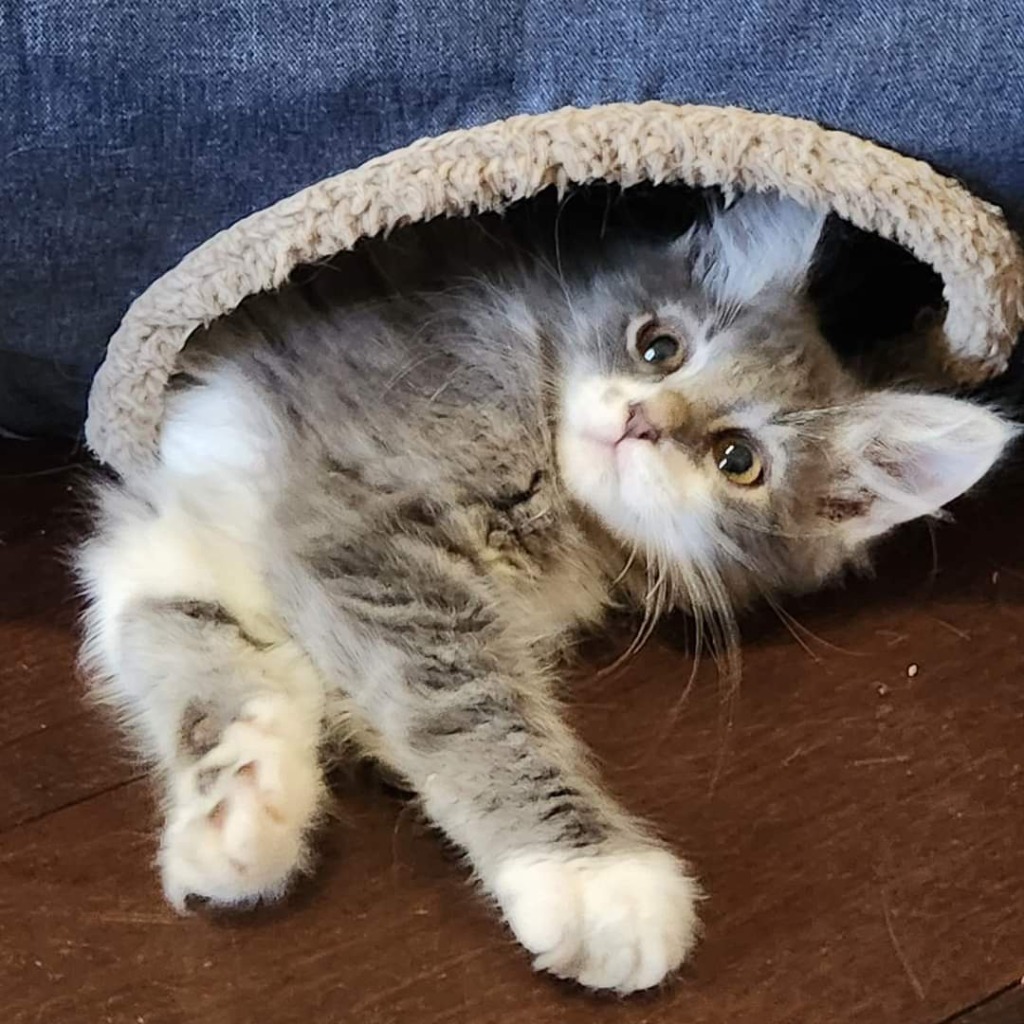 Juniper can cohabit with a calm dog, and isn't afraid to put a playful pup in their place. Would need constant supervision around other pets. Like most growing kittens, Juniper is very food motivated.