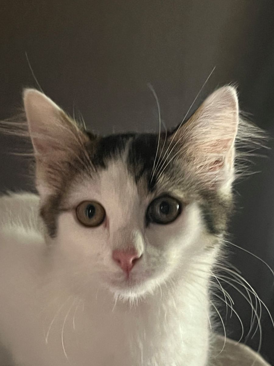 Tinsel is a friendly little kitten. She loves playing with her brother and sister and scrambling up and down the cat tree (when there are no Christmas trees to be had).