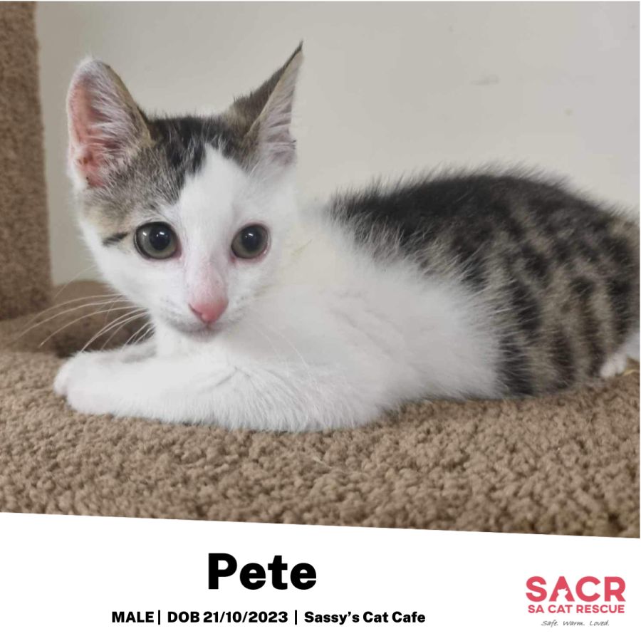 Pete's adoption fee is $180 which includes desexing, microchipping, parasite prevention, and F3 vaccination.