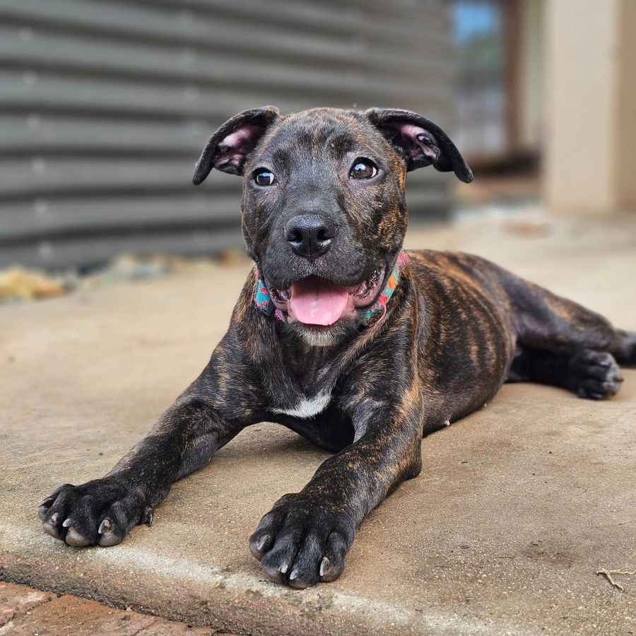 Paxton is a sweet, social and playful girl. She's confident and outgoing and loves attention. She is sharing her environment with no hassles, bedding, food, toys etc. She is currently living with adult dogs and other pups of all sizes and she has blended straight in without any concerns at all. Paxton will be a medium sized girl, she has typical staffy energy and will benefit greatly from owners who are familiar with the breed and a puppy school with ongoing training. She's a beautiful natured girl and will thrive with training. She's not yet fully vaccinated so hasnt been out walking or begun lead training but I dont forsee any problems, she's just happy go lucky breezy girl