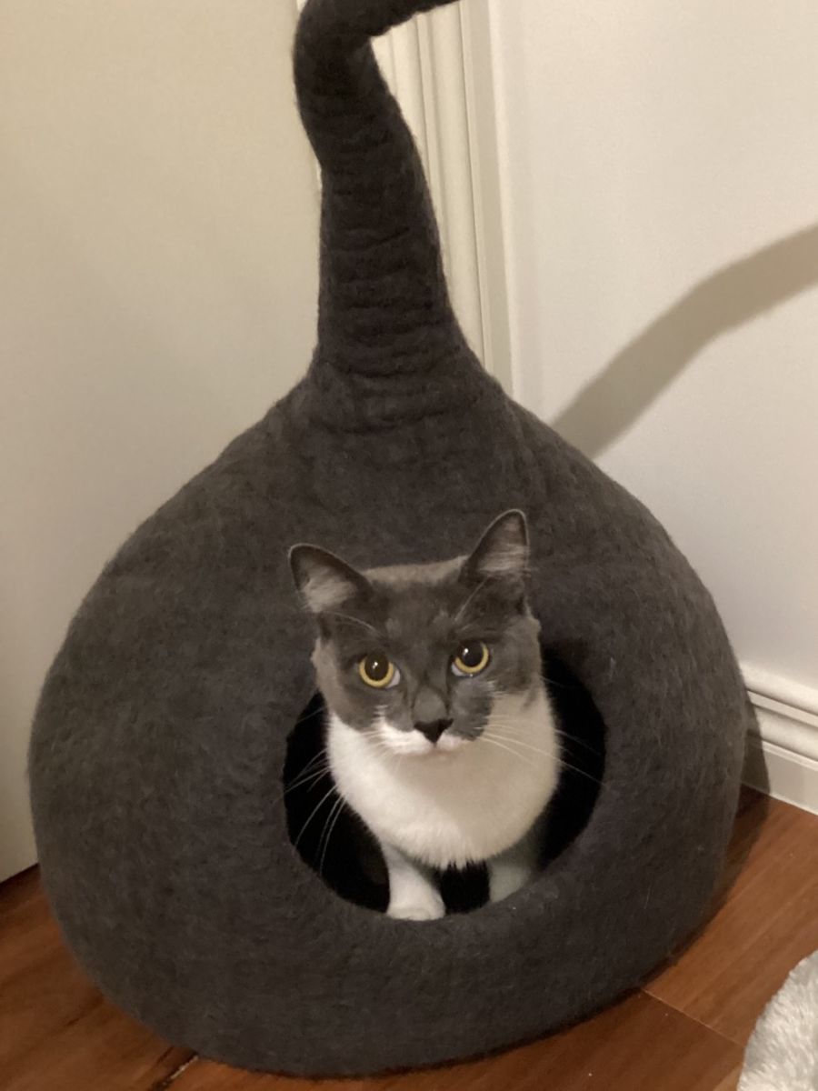 Initially Remi would love to have a safe place to hide, like an enclosed cat bed, where she can feel safe and venture out from when she's feeling confident. She will always been in the mood for pats if you approach her and will turn into a little purring machine when you're around, but she may take a few days build her confidence and start to seek you out for attention.