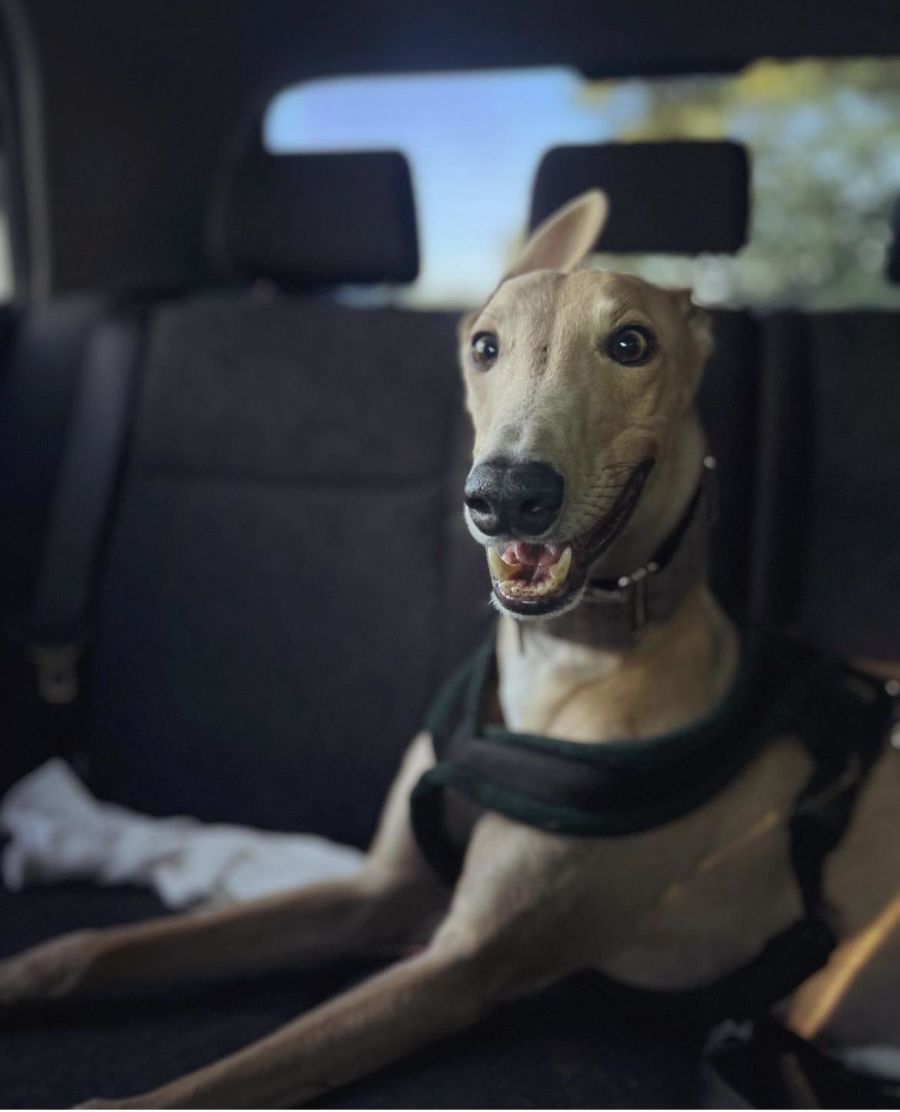 His foster carers adore him. They have told us that he’s too friendly for guard dog potential, but could be a smoochy cat masquerading as a loveable greyhound. He loves a road trip and outing but also loves cuddling up with his foster carers on the couch.