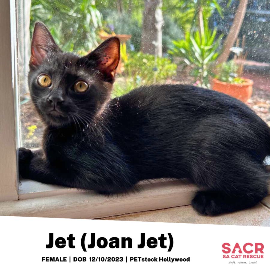 Jet's adoption fee is $180 which includes desexing, microchipping, parasite prevention, and F3 vaccination.