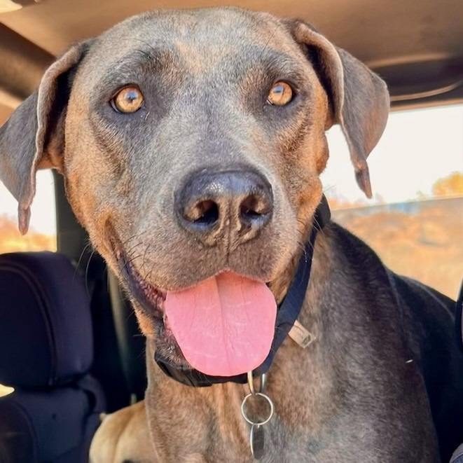 Hi! I'm Fate, and I am good with all. She has a very calm and gentle nature. She shows no interest in the cat, is submissive with the dogs. She is great with the kids, doesn’t get in their face and is gentle and keen when they want to play, even the baby. She is toilet trained but will not make a noise to go out if she is locked in. She is not high energy, is happy to sleep a lot of the day but does love a run around with the other dogs. She is very attached to her humans and will cry if she can see you but cant be with you. She is a bit food obsessed as you can imagine with her history, and will take food off benches. She has learnt not to go to other dogs bowls though, and getting better with the bench. She is such a gorgeous girl.