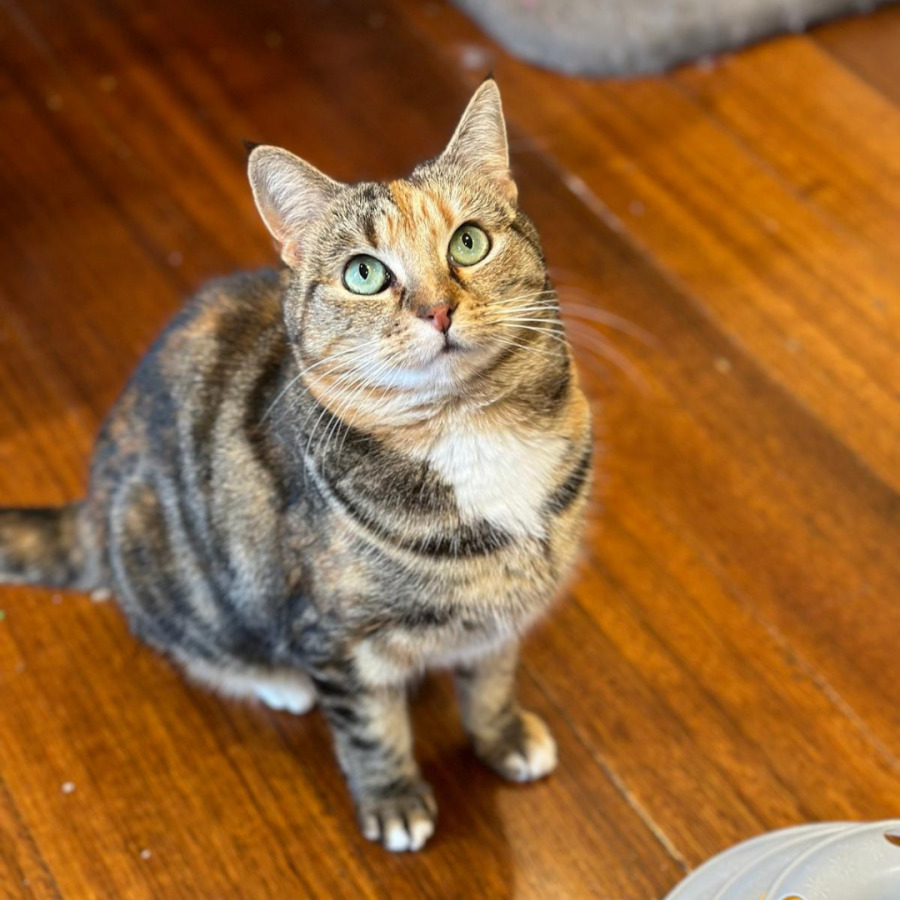 Lexi is a stunning cat with big green eyes and mesmerising torbie (mix tortoiseshell + tabby) coat. Since moving in with us, she has developed a healthy appetite and the cutest double chin.