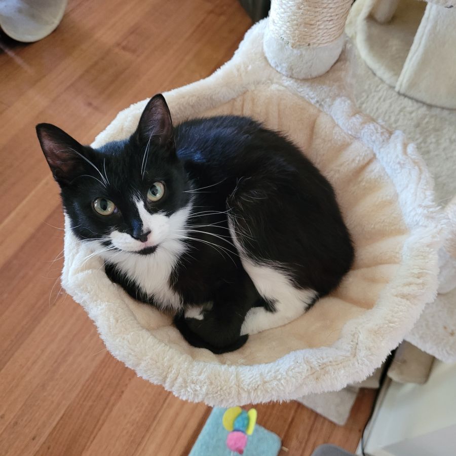 This petite girl is still adjusting to human life, but with patience and understanding, she can blossom into a loving and affectionate companion. She's happiest when she has a feline friend to cuddle with and explore with.