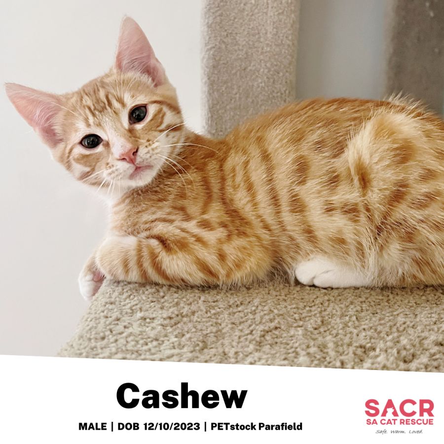 Cashew's adoption fee is $180 which includes desexing, microchipping, parasite prevention, and F3 vaccination.