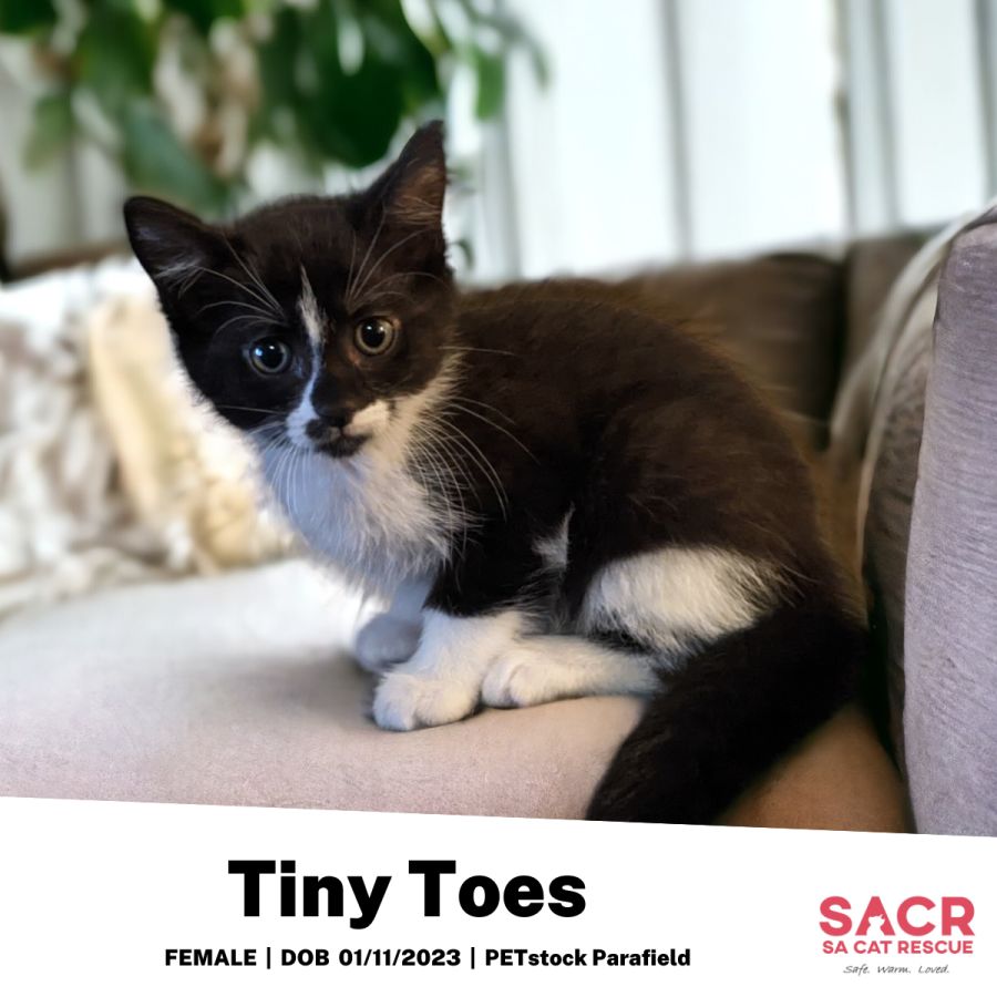 Tiny Toes' adoption fee is $180 which includes desexing, microchipping, parasite prevention, and F3 vaccination.