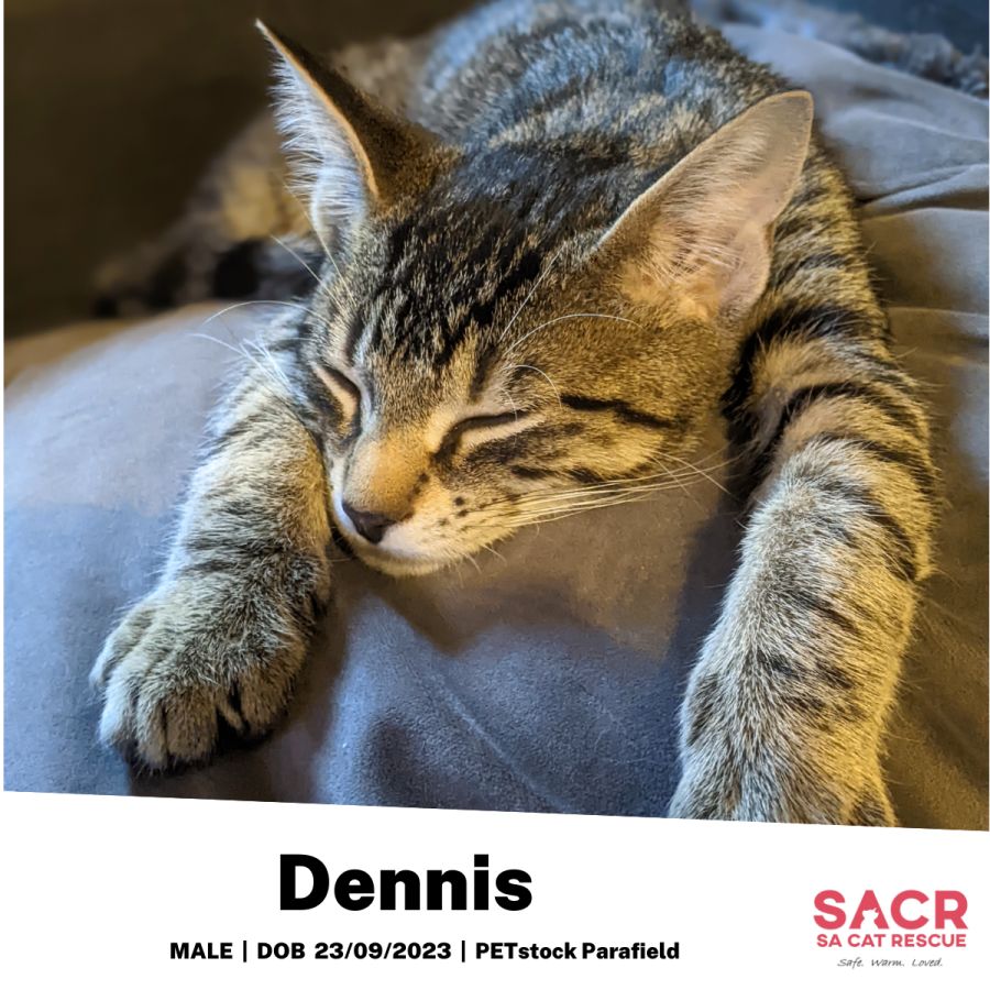 Dennis' adoption fee is $180 which includes desexing, microchipping, parasite prevention, and F3 vaccination.