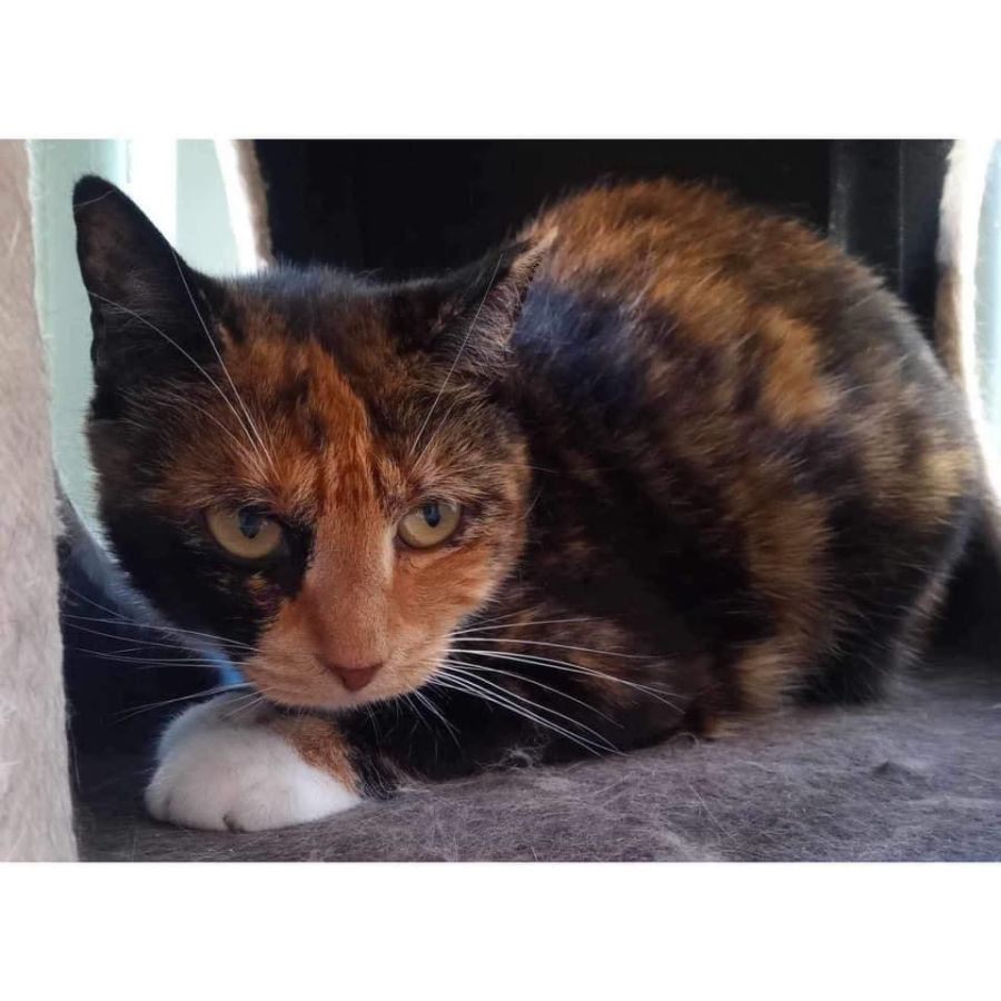 Hattie came into care over two years ago with an attitude befitting the streets. Over time, she has gone from hiding in the cat run, to hiding in the front room, to hiding in the dining room, to lounging at the top of the cat tower in full view of her Foster Mum in the main room. While sheās still a force to be reckoned with, sheās showing all the signs of a girl who is ready for the warmth of a loving home.