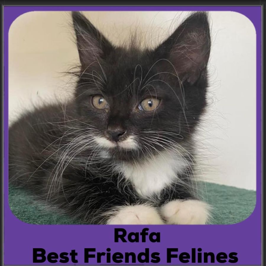 Rafa is a big, goofy fluffball, with eyebrows to die for! He is still learning how to cope with his fluffiness, and is often seen with bits of food stuck in his floof! He is just adorable. Rafa loves a cuddle but then is off again running amok with his siblings. He's a great climber and loves chasing his kitten wand, and balls. I dare anyone to meet Rafa and not fall instantly in love.