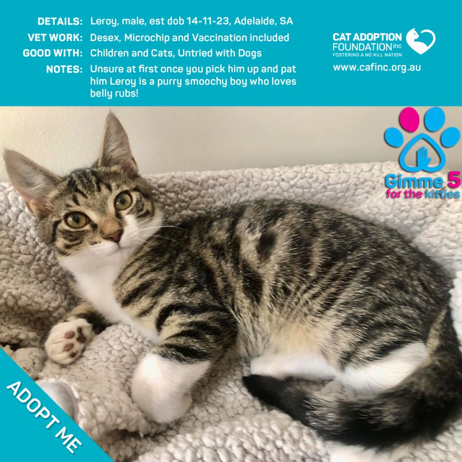 Donate to Leroy at Cat Adoption Foundation Incorporated via Shout