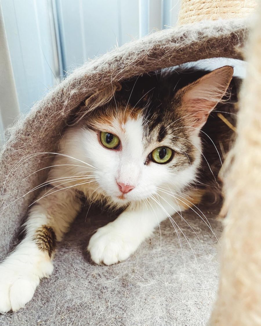 Callie is approximately 2 years old and came to care after being found abandoned. Callie has unfortunately had a fair few litters of kittens, but thankfully this is her absolute last. Callie is a sweet, easy-going and independent lady with lots of love to give. She would suit a mature home with a chill family who won’t ask too much of her. She loves attention once she is comfortable, however does need time to bond to new humans. At first, Callie did not like the company of other cats and dogs, however now that her babies are grown, she tolerates them much better. She is currently housed with another junior and other male and female kittens who she gets along with fine. She is also in the company of dogs, but will keep her distance from them. Callie can be easily startled and shys away from loud noises, so ideally wants a quiet home. She will make a gorgeous companion for that special someone, she is relaxed and would suit both an indoor and outdoor setting well.