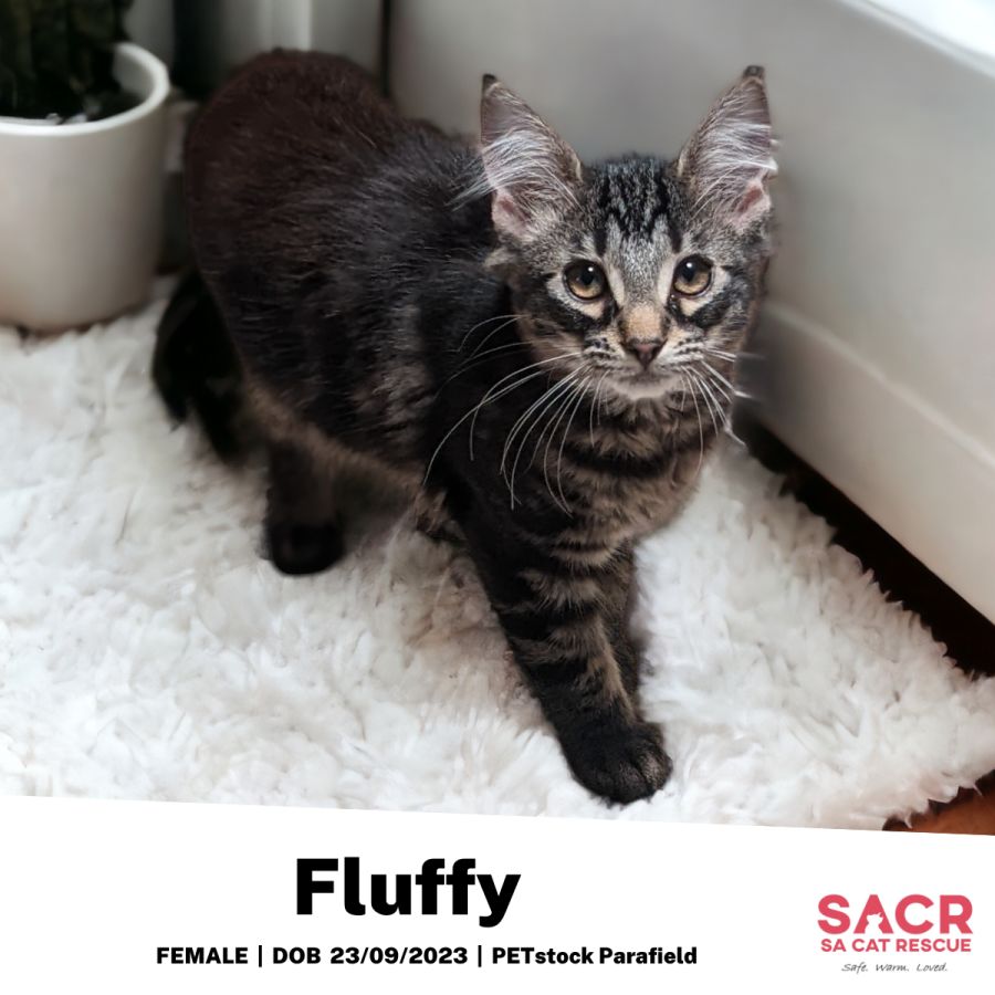 Fluffy's adoption fee is $180 which includes desexing, microchipping, parasite prevention, and F3 vaccination.