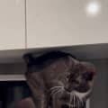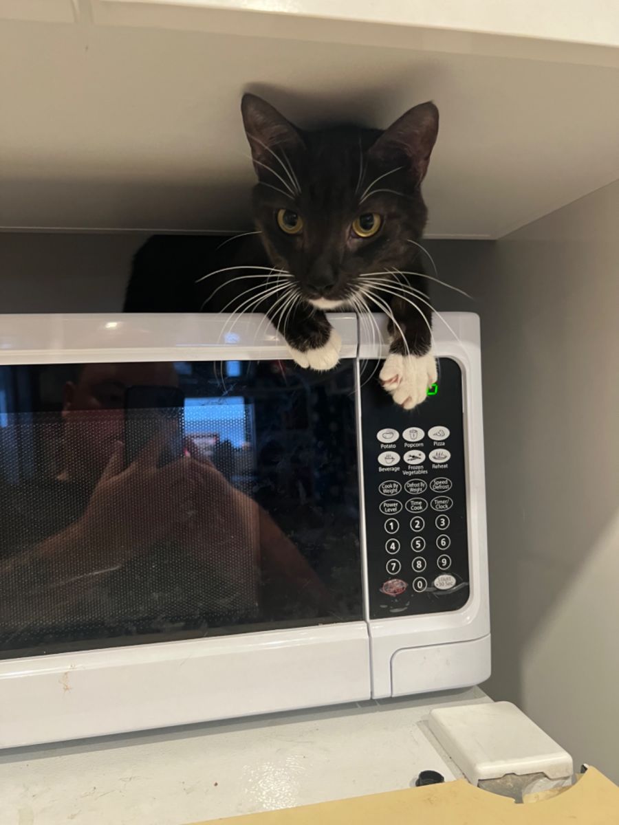 The first couple days he was here he hid on top of my microwave, which is where the cute photos came from, but now that he's settled he just will not leave me alone.